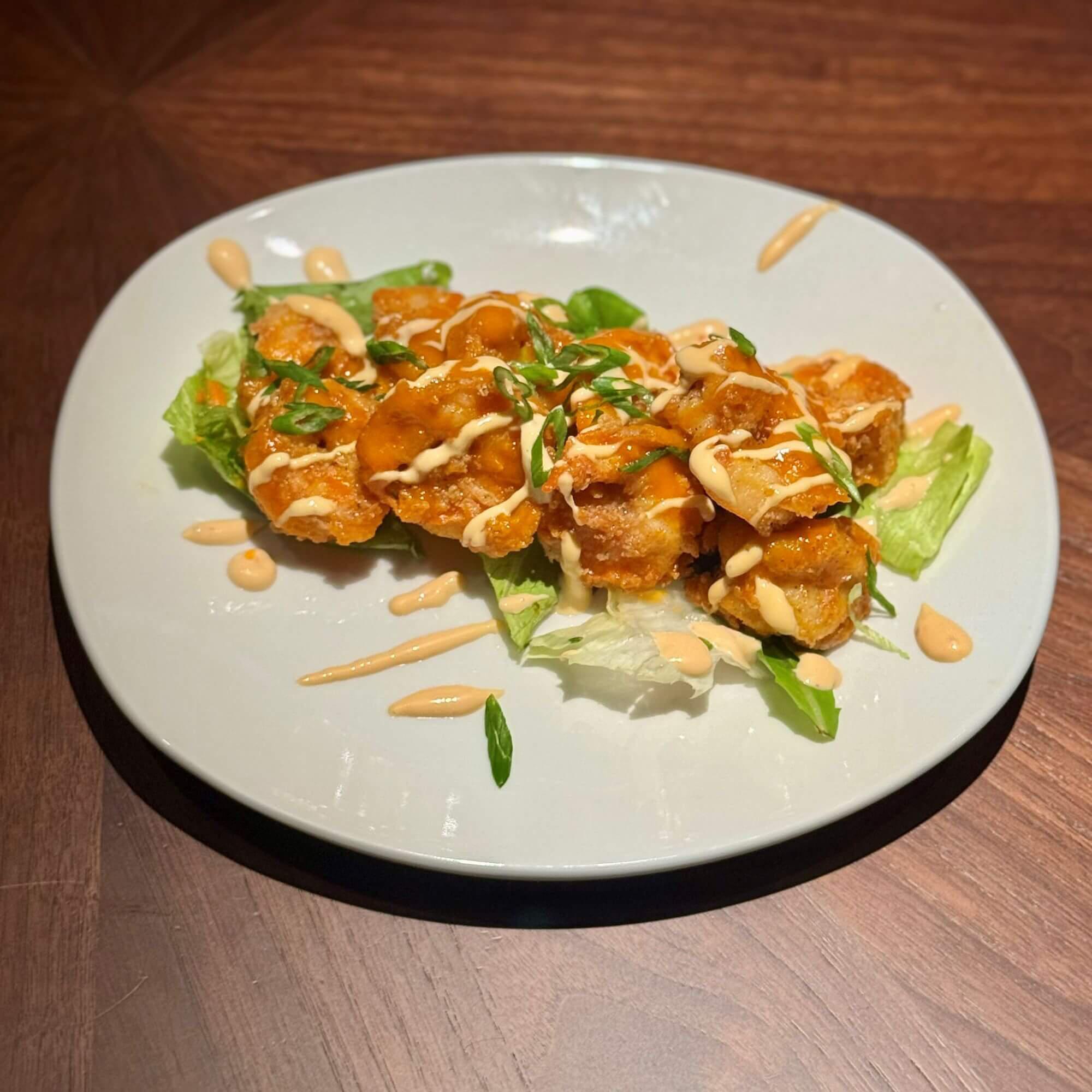 Hand breaded Marinated Jumbo Shrimp, Flash Fried & Tossed In Our Special Sweet N Spicy Pineapple Sriracha Sauce.Topped With Chipotle Crema.
