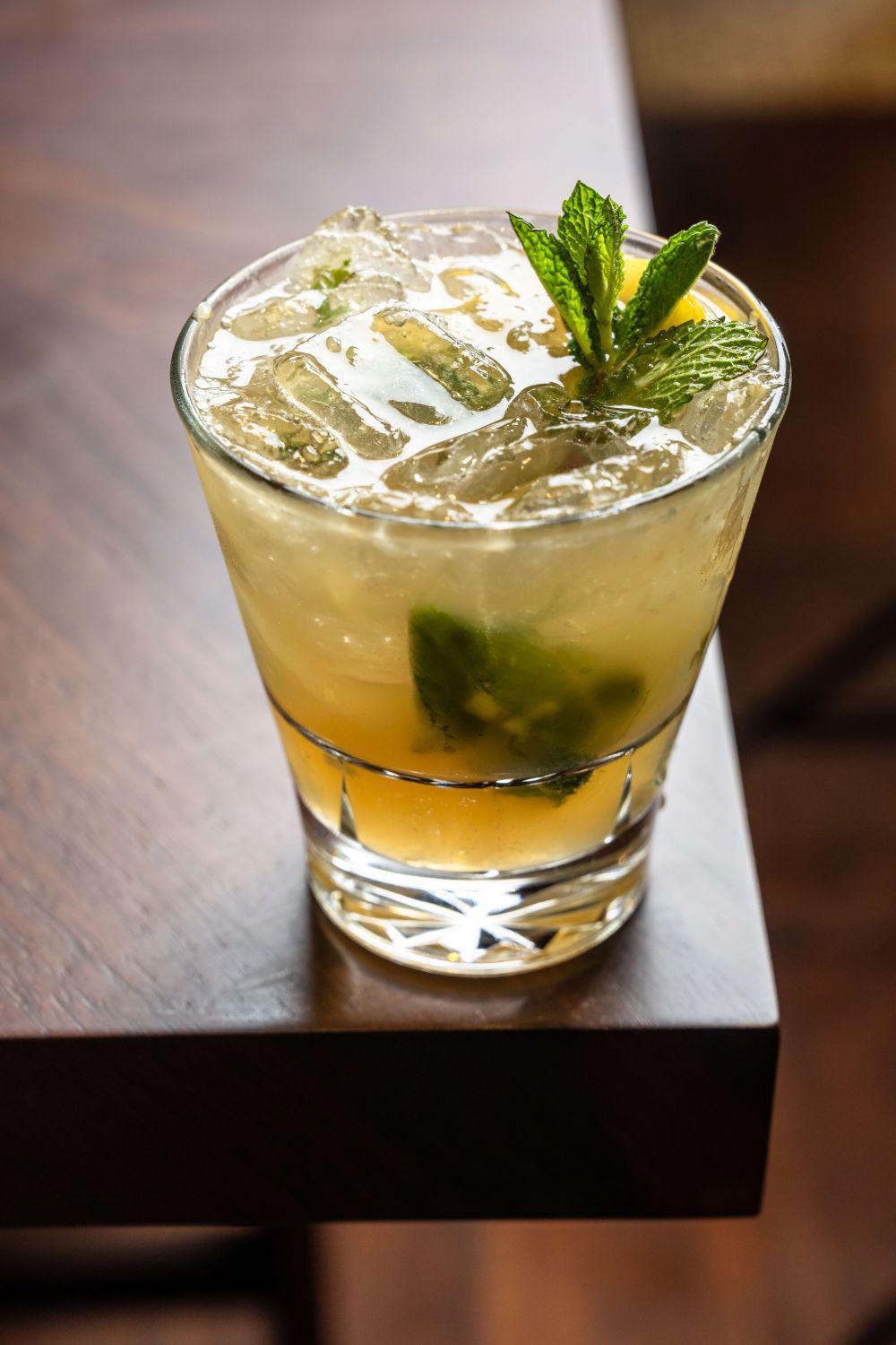 Old Forester bourbon, fresh muddled lemons & ginger, just a touch of simple syrup & topped with a splash of seltzer.