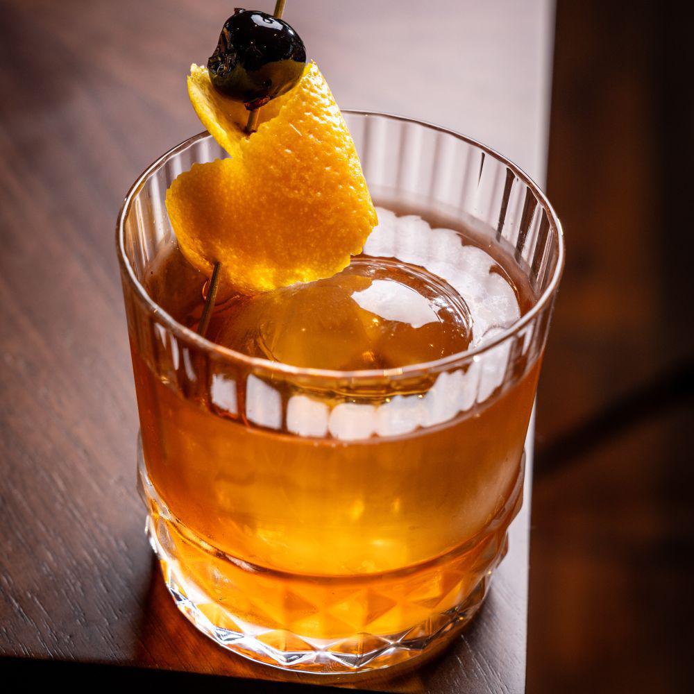 Our house old fashioned, made with Jack Daniels Bonded bourbon, demerara sugar, angostura bitters, served on large spherical ice with brandied cherries & orange peel for aromatics.