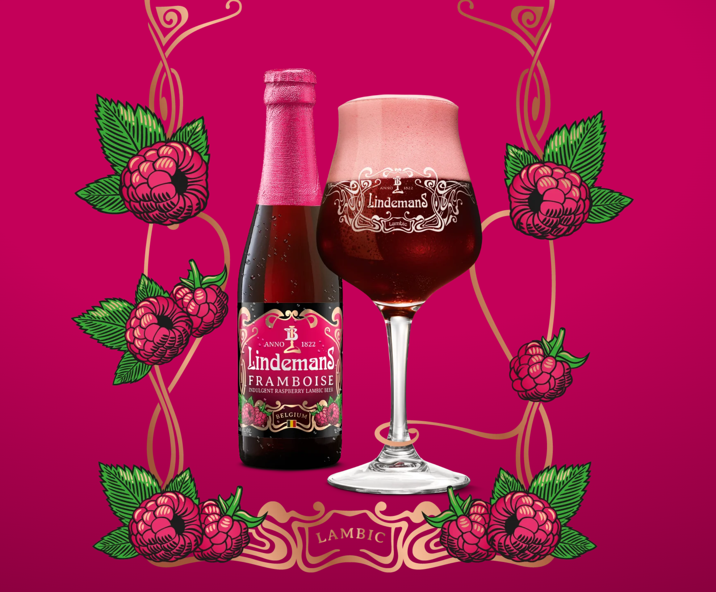 A world-renowned Belgian fruit lambic known for its intense raspberry aroma, deep ruby-red color, and vibrant pink head. It delivers a sweet-yet-tart flavor profile, combining natural raspberry juice with a subtle, complex, and sour lambic base