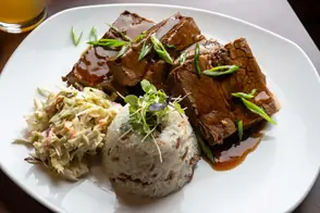 Tender USDA Prime brisket, slow-braised in its own juices & Mirepoix, Hand trimmed fork-tender slices rest aside our signature steamed jasmine rice with toasted orzo & home made slaw.