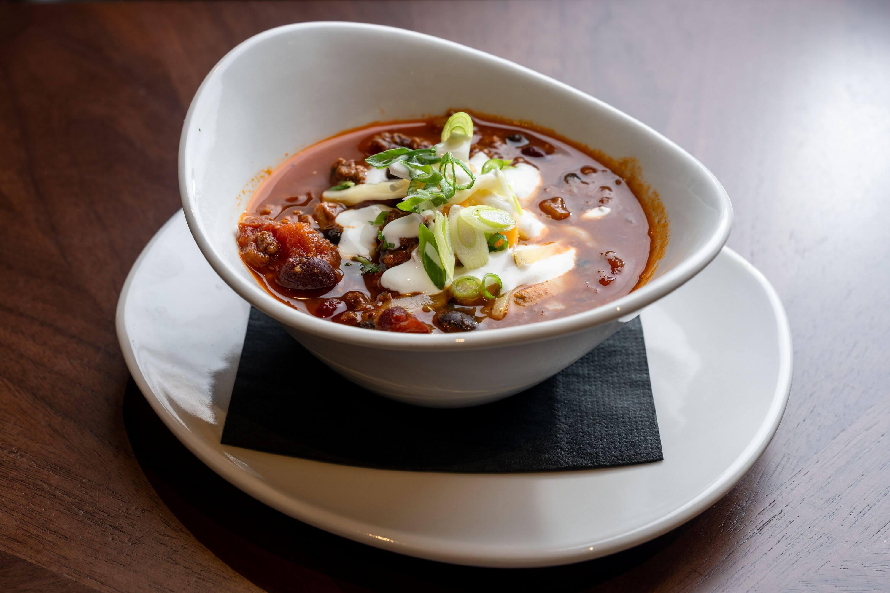Featuring a blend of brisket, chuck & short rib ground in house. Slowly stewed together with peppers, onions, beans & spices. Topped with scallions, cheddar jack cheese & sour cream. Served with fresh baked bread.