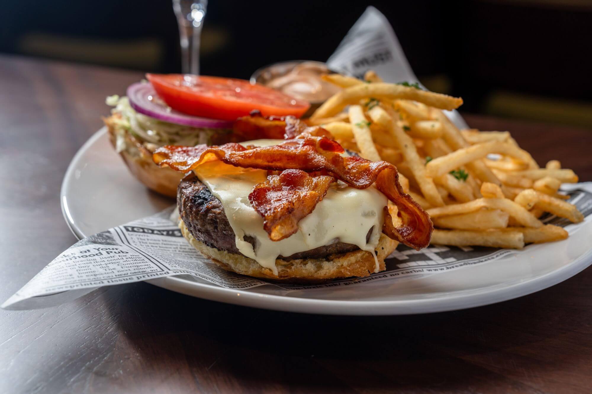 ½ LB Burger Served With Shredded Lettuce, Tomatoes, & Red Onions. Then Topped With Your Likings, & Served With Shoestring Fries,