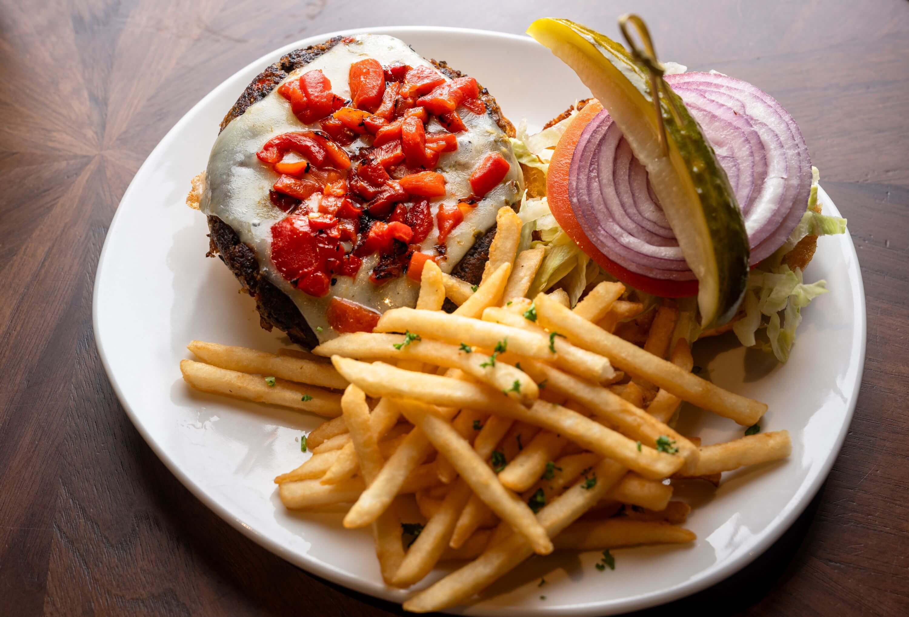 A True veggie burger we make in-house with roasted corn, black beans, quinoa, mushroom medley & garden veggies. Topped with roasted red peppers, pepper jack cheese & house special sauce.