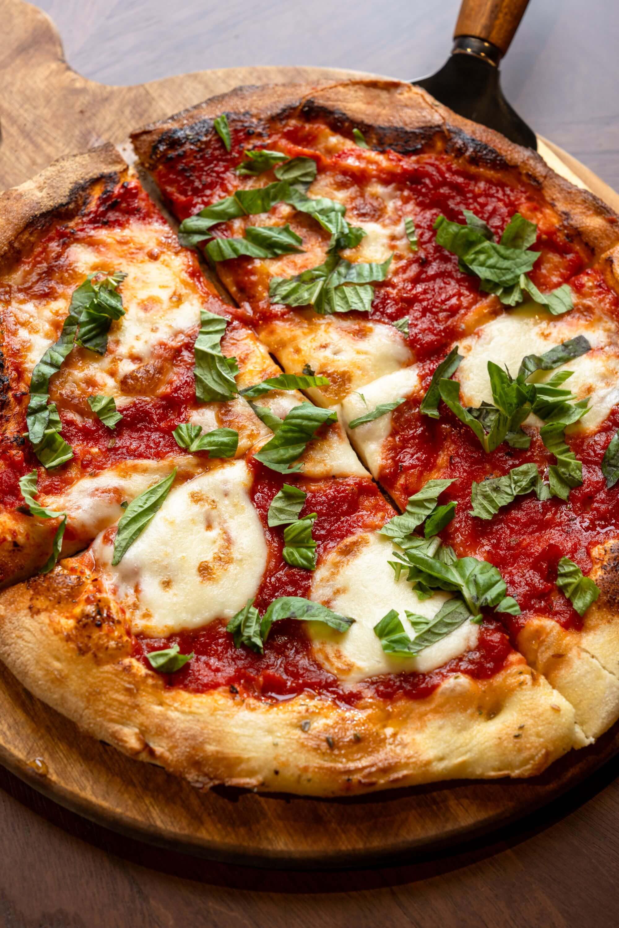 Garlic herb & classic tomato sauce, fresh mozzarella & topped with fresh basil.