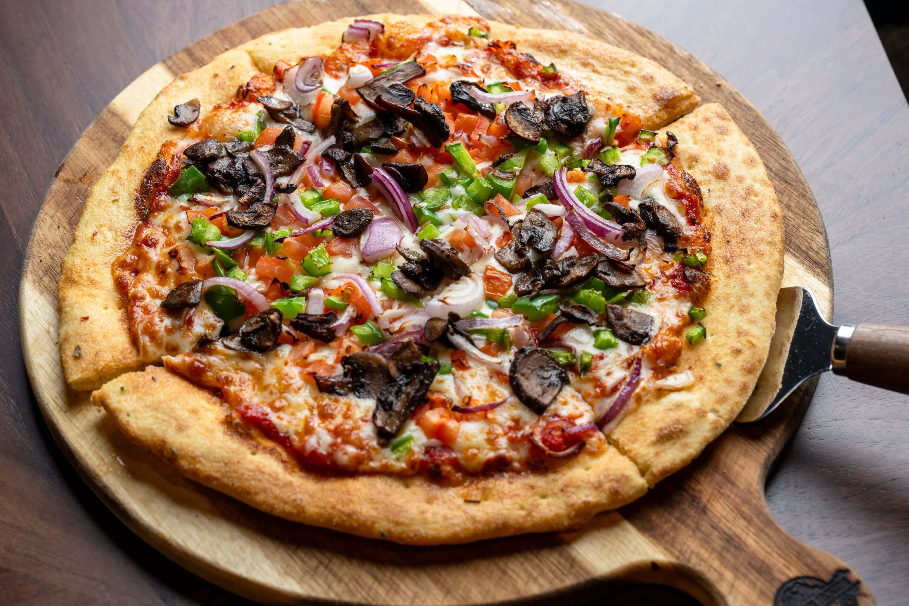 Classic tomato sauce, mozzarella cheese, diced tomatoes, bell peppers, cremini mushrooms & red onions.