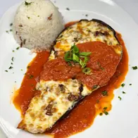 Tender USDA Prime brisket, slow-braised in its own juices & Mirepoix, Hand trimmed fork-tender slices rest aside our signature steamed jasmine rice with toasted orzo & home made slaw.