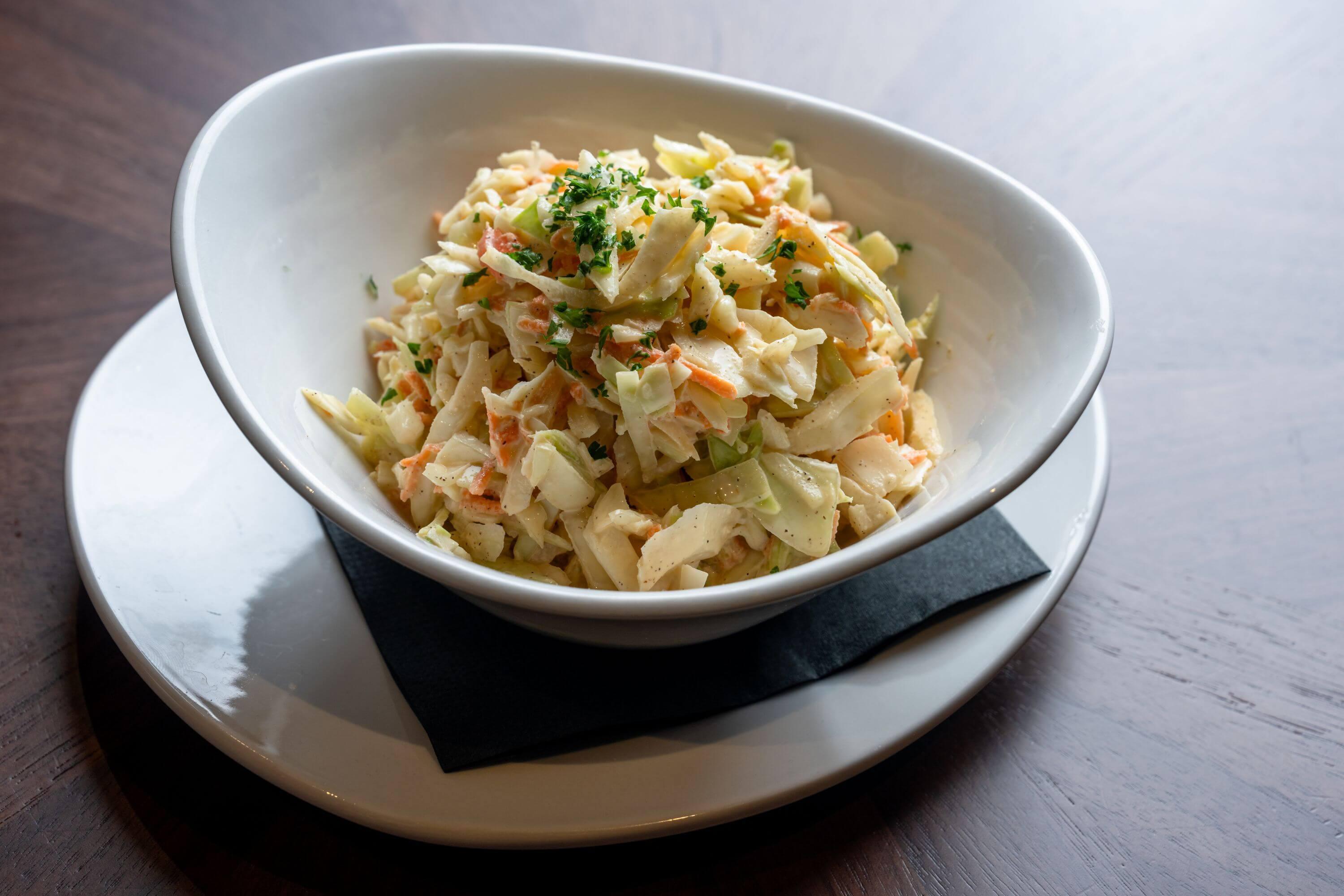 A blend of hand shreded cabbages, & carrots tossed in our house slaw dressing.
